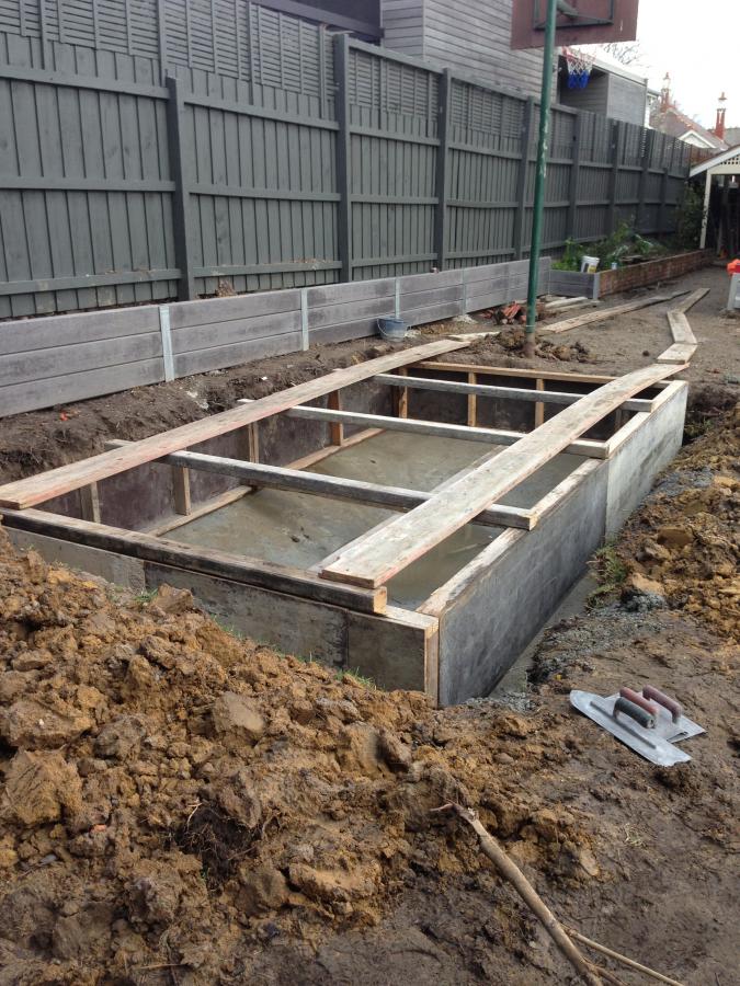The concrete sleeper retainer wall is 2m charcoal coloured concrete sleepers with gal H beams.The hole you see the form work in is for a ground level trampoline 4.9m x 2.7m with the depth being formed to Olympic standards.At the bottom of the hole there is in place a pit ( for the submergible pump ) a 40mm high pressure pipe (for pumping out rain water ) and the conduit has been placed for power.